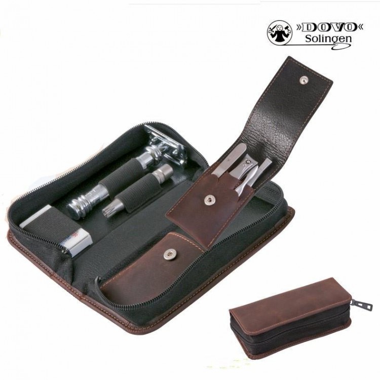 - obsah velkého pouzdra : holicí strojek MERKUR Solingen 38 001, žiletky MERKUR Solingen 910 000 (10 ks), mechanický kovový zastřihávač chloupků DOVO Klipette 385 006, + vyjímatelná manikúra
