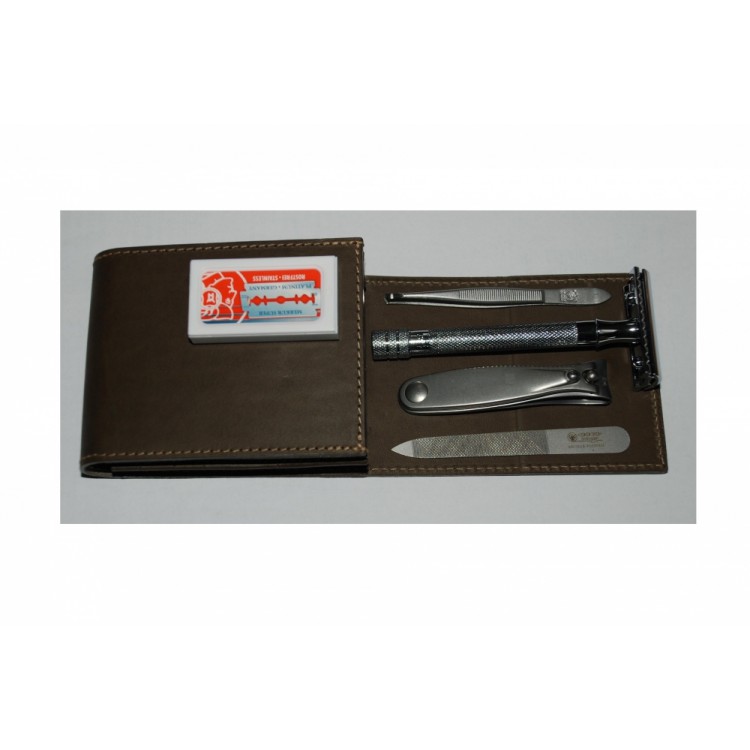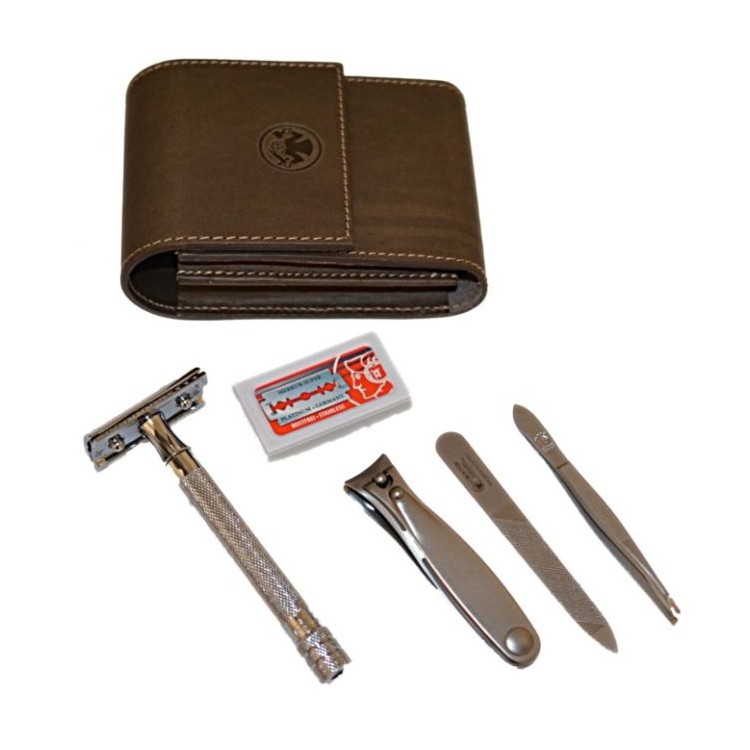 - obsah: celokovový chromovaný holicí strojek MERKUR Solingen 38 001 na klasické žiletky s dlouhým držadlem, nerezové štipky na nehty DOVO 504 006, nerezová pinzeta DOVO se šikmým zakončením, nerezový pilníček na nehty DOVO, žiletky MERKUR Solingen 910 000 (10 ks v balení)